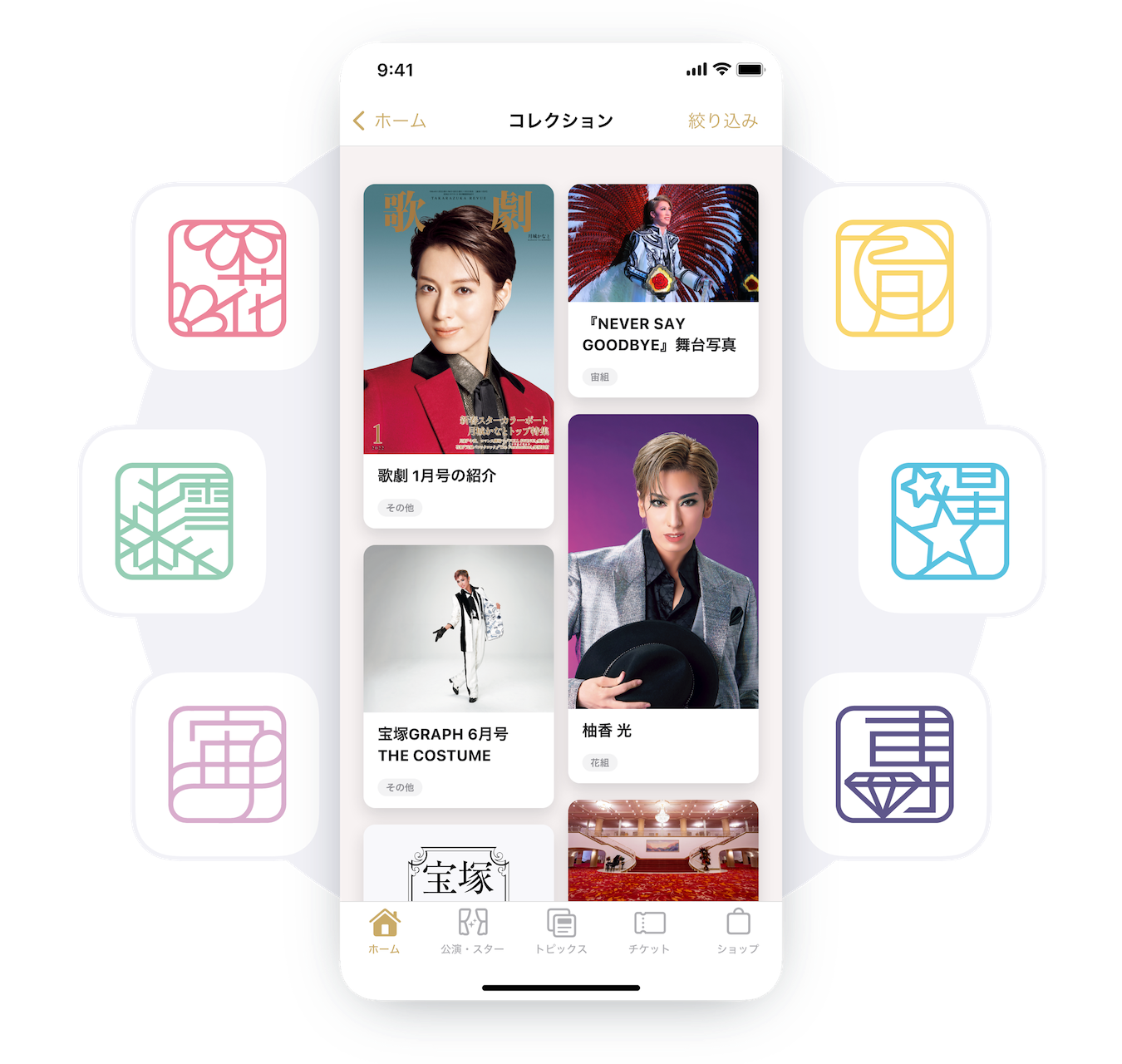 劇場を彷彿させる配色は一際目を引くデザインとなり、宝塚歌劇の担当者や想定ユーザーの方に調査した段階から好評をいただくことができました。特に配信される情報を自分好みにコレクションできる満足感を評価していただいています。