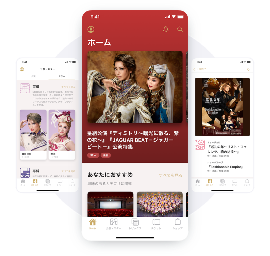 宝塚大劇場を象徴する赤絨毯のレッドと輝くシャンデリアのゴールドを基調とし、アプリをタップすると、まるで劇場に足を踏み入れたかのような体験ができるよう意識しました。